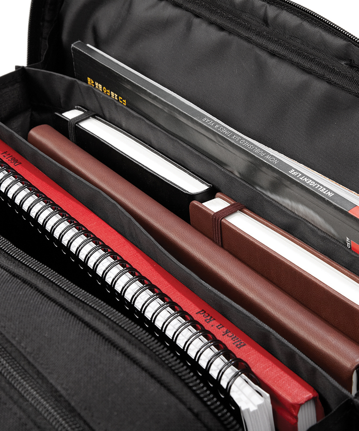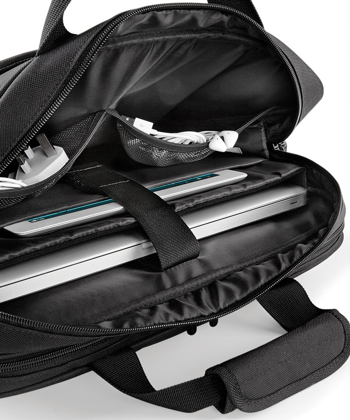 - Triple compartment design. Laptop compatible up to 17″. Padded laptop compartment. Document section. Detachable adjustable shoulder strap with pad. Zippered front pocket. Organiser section. USB memory stick loops. Wheelie bag strap. Padded handle. iPad mini/Tablet compatible.